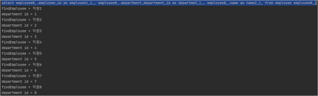 @Test void v1() { List<Employee> findEmployees = employeeRepository.findAll(); for (Employee findEmployee : findEmployees) { System.out.println("findEmployee = " + findEmployee.getName()); System.out.println("department id = " + findEmployee.getDepartment().getId()); } }저희의 예상과는 달리 모든 직원을 조회하는 쿼리가 하나만 나갈 뿐 department를 조회하는 N + 1 문제가 발생하지 않습니다. 왜 그럴까요?