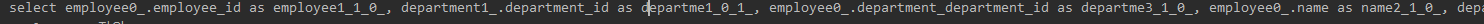 @Query("select e from Employee e join fetch e.department") List<Employee> findAllWithDepartment();Employee의 alias를 e로 설정하고 e.department로 join fetch하여 하나의 쿼리로 조회하는 것을 확인할 수 있습니다.