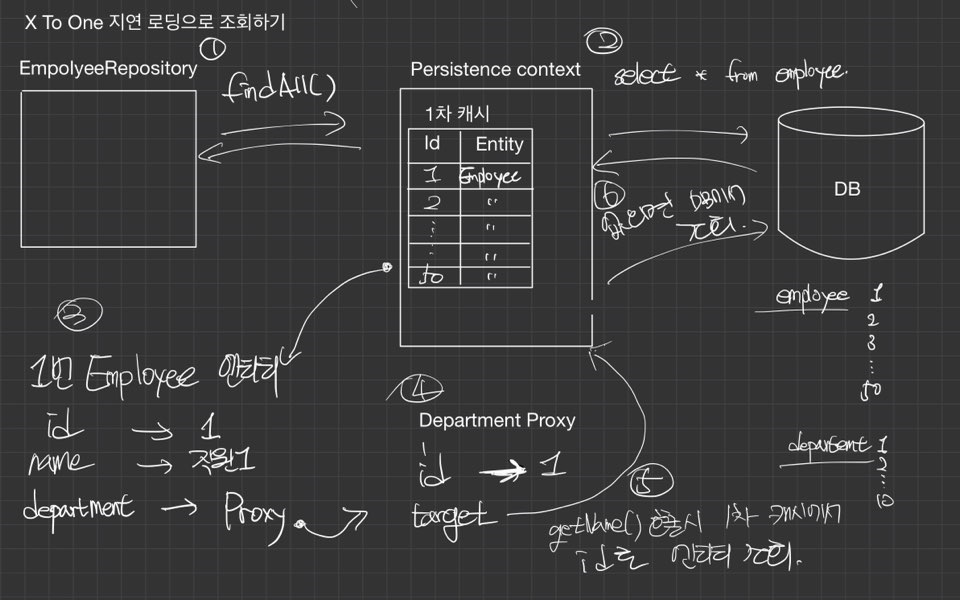 @Test @DisplayName("X To One 관계에서 지연 로딩으로 조회하기") void v1() { List<Employee> findEmployees = employeeRepository.findAll(); for (Employee findEmployee : findEmployees) { System.out.println("employee = " + findEmployee.getName()); System.out.println("department name = " + findEmployee.getDepartment().getName()); } }직원을 조회하는 쿼리와 부서의 이름을 가져올 때 마다 추가적으로 쿼리가 나가는 것을 볼 수 있습니다. 그 이유는 Employee Entity에서 Department의 fetch를 LAZY로 설정했기 때문에 department가 필요한 시점에 DB에 조회 쿼리를 날려 가져오는 것 입니다.