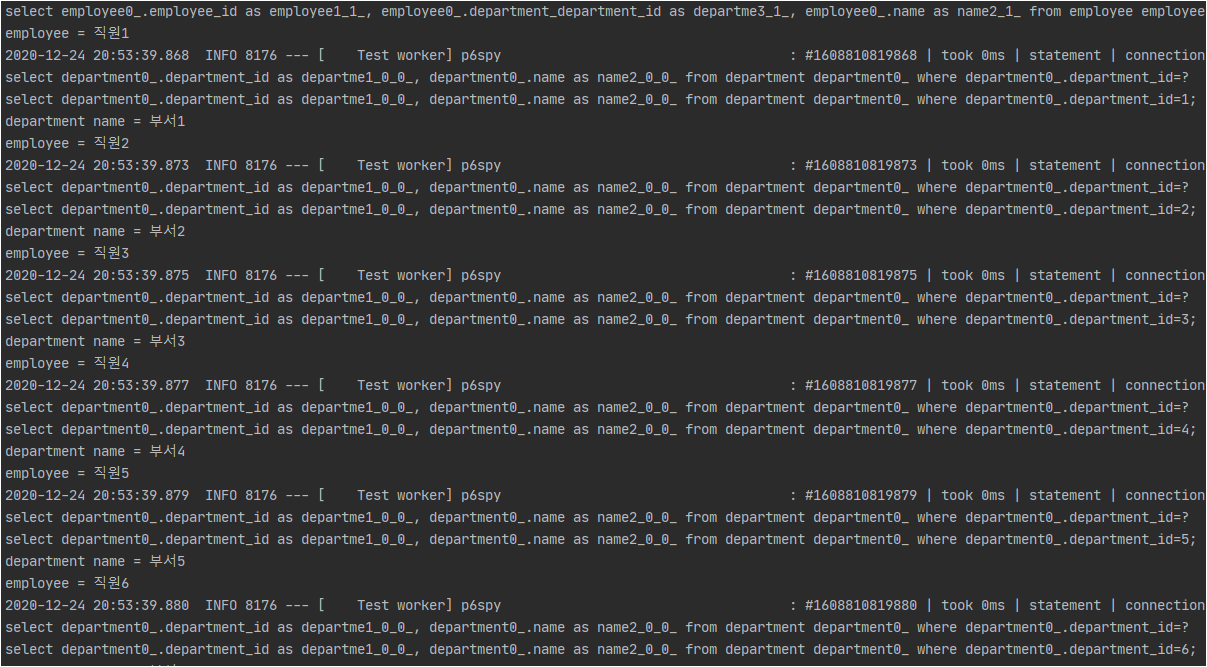 @BeforeEach void setup() { // 부서 10개 저장 for (int i = 0; i < 10; i++) departmentRepository.save(new Department("부서" + (i + 1))); List<Department> findDepartments = departmentRepository.findAll(); // 직원 50개 저장 for (int i = 0; i < 50; i++) employeeRepository.save(new Employee("직원" + (i + 1), findDepartments.get(i % 10))); em.flush(); em.clear(); }모든 직원을 조회한 후 각각의 직원의 department의 name을 조회하는 테스트 코드를 실행시키면 어떻게 될까요?